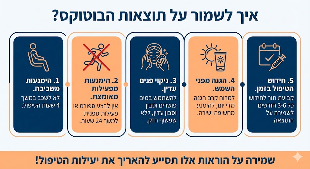 אז מה אפשר לעשות כדי לשמור על התוצאות של הבוטוקס? הנה כמה טיפים שיעזרו לך למקסם את ההשפעה ולשמור על מראה צעיר ורענן: