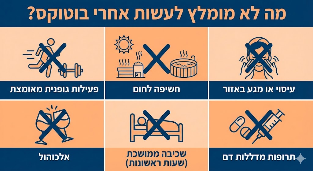 חשוב להימנע מכל פעולה שעלולה להפעיל לחץ על האזור, כמו שינה על הפנים או חבישת כובע צמוד. מומלץ להמתין לפחות כמה שעות, ובמקרים מסוימים אפילו יום שלם, לפני שחוזרים לשגרת היום-יום הרגילה. זה הזמן של הבוטוקס "להתיישב" במקום הנכון.